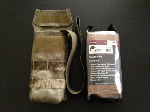Quick Clot Combat Gauze LE, Z-Folded, Nasopharyngeal Airway 28fr w/lube, (1pr) HALO Chest Seals, Israeli Bandage 4", H&H Compressed Gauze, Elastic Bandage 3", Nitrile Gloves Large (1pr).